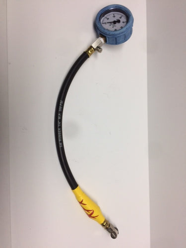 COMPLETE AIR GAUGE WITH AIR RELEASE BUTTON, 60PSI MAX, WITH PROTECTIVE RUBBER BEZEL. 18'' HOSE